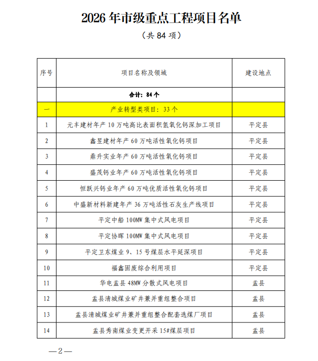 阳泉市人民政府办公室 关于印发2026年市级重点工程项目名单的通知