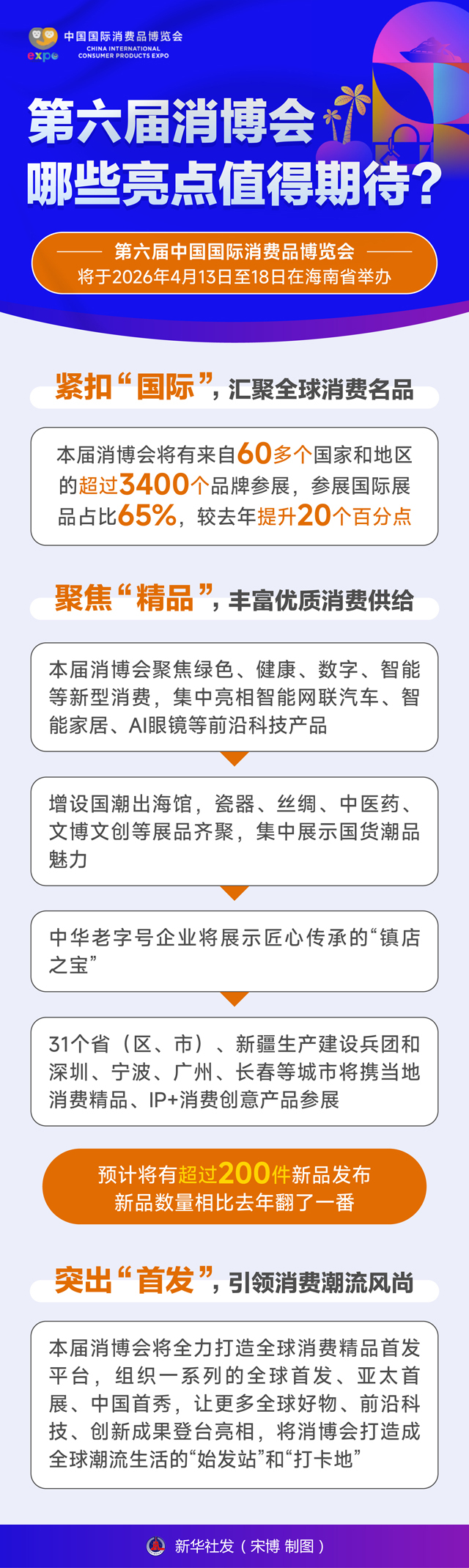 第六届中国国际消费品博览会将于今年4月13日至18日在海南省举办。作为海南自贸港全岛封关运作后的首场重大展会,本届消博会有哪些亮点值得期待?国新办3月30日举行新闻发布会,介绍了相关情况。